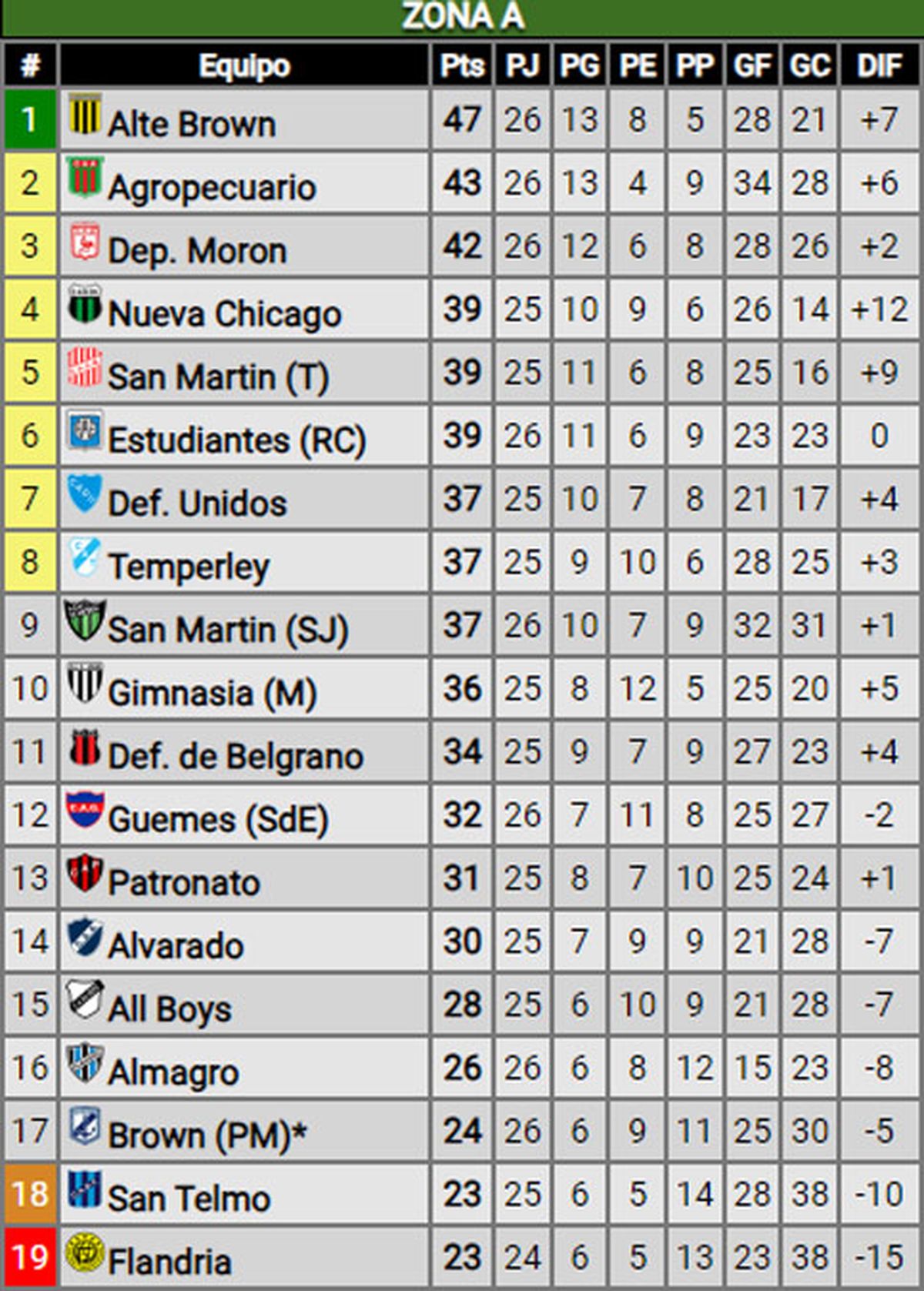 En la zona A de la Primera Nacional, el líder es Almirante Brown, con 47 puntos.