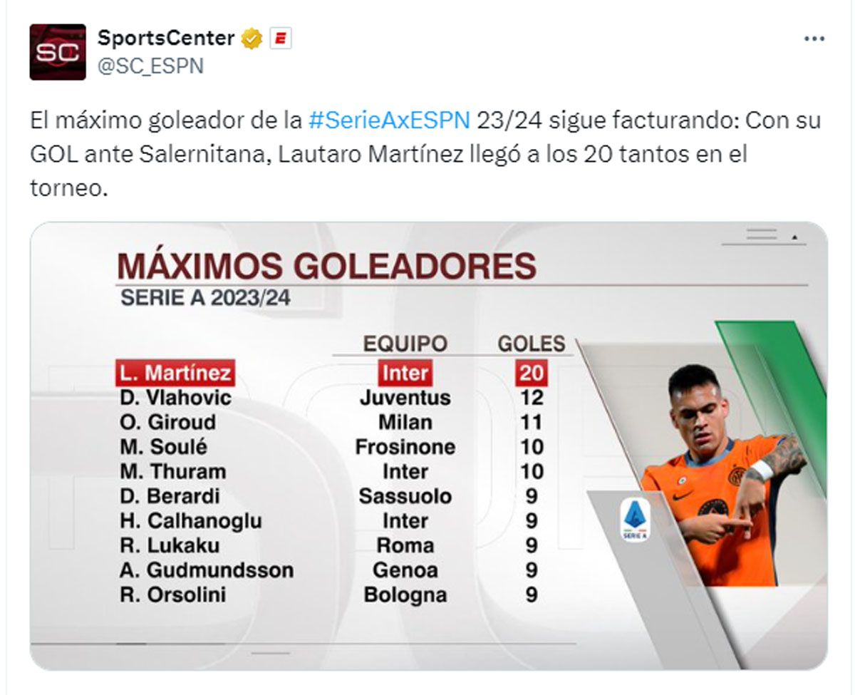 El "Toro" alcanzó los 125 goles en el equipo milanés y superó los 124 de Mauro Icardi. Además, acumula 20 en la Serie A, sobre 22 partidos disputados, y es el máximo anotador seguido por el croata Dusan Vlahovic (12).