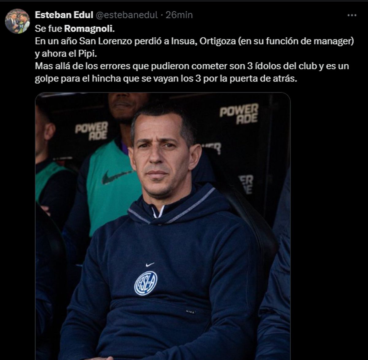 "Solo nos quedan palabras de agradecimiento para el Pipi y su cuerpo técnico por el trabajo, por la dedicación y en especial por privilegiar siempre a las necesidades de San Lorenzo por sobre todas las cosas", agregó el comunicado.