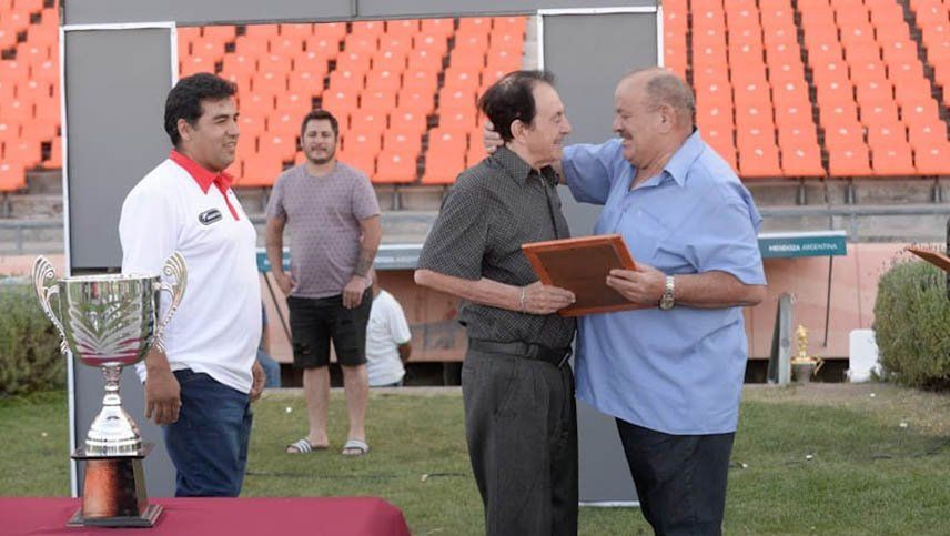 El ídolo de Gimnasia y Esgrima, Víctor Legrotaglie, recibió un reconocimiento de parte del presidente de la Liga Mendocina de Fútbol, Carlos Suraci.