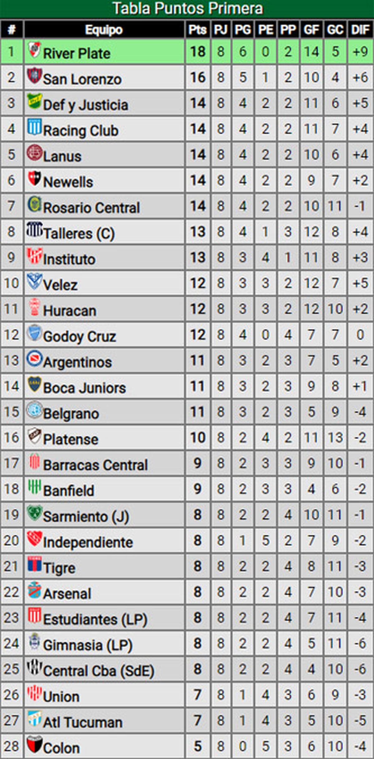 Se completó la 8ª fecha de la Liga Profesional y River es líder en solitario. Godoy Cruz había logrado el sábado un gran triunfo ante Belgrano