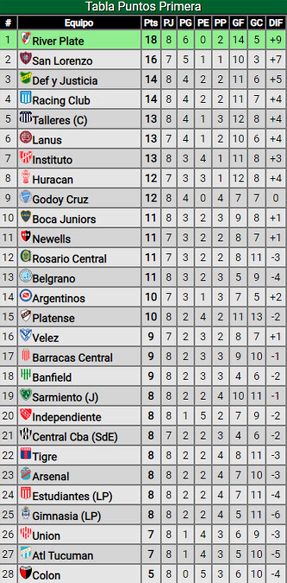 A falta de cuatro partidos, tres este lunes y otro el martes, la tabla de posiciones tiene a River Plate como único puntero de la Liga Profesional.