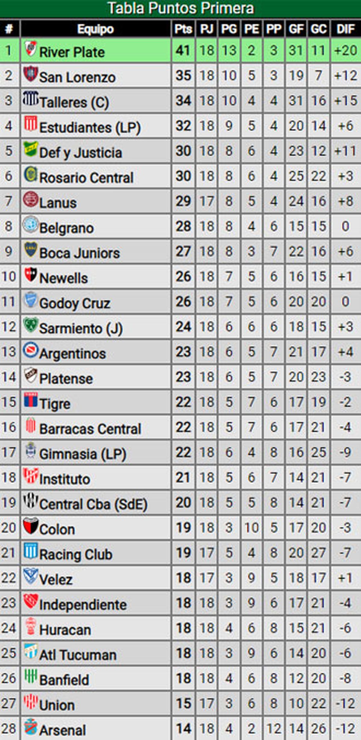 La tabla de posiciones de la Liga Profesional sigue teniendo a River Plate en lo más alto, luego de completarse el lunes por la noche la 18ª fecha.