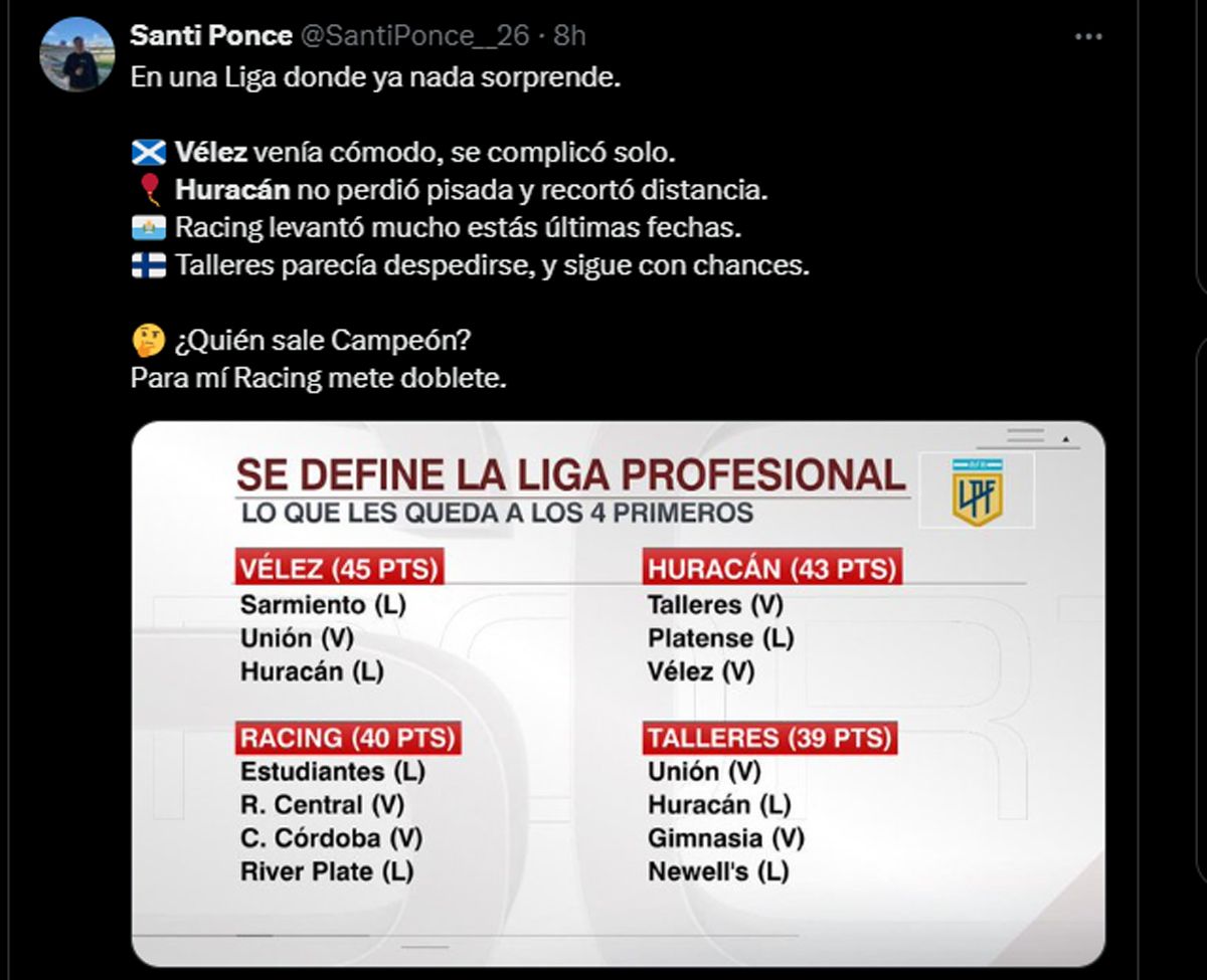 El otro postulante a ganar la Liga Profesional es Talleres, 4to. con 39 puntos en 23 fechas. La T puede acercarse a 3 puntos de la cima si le gana este martes a Unión, en Santa Fe.