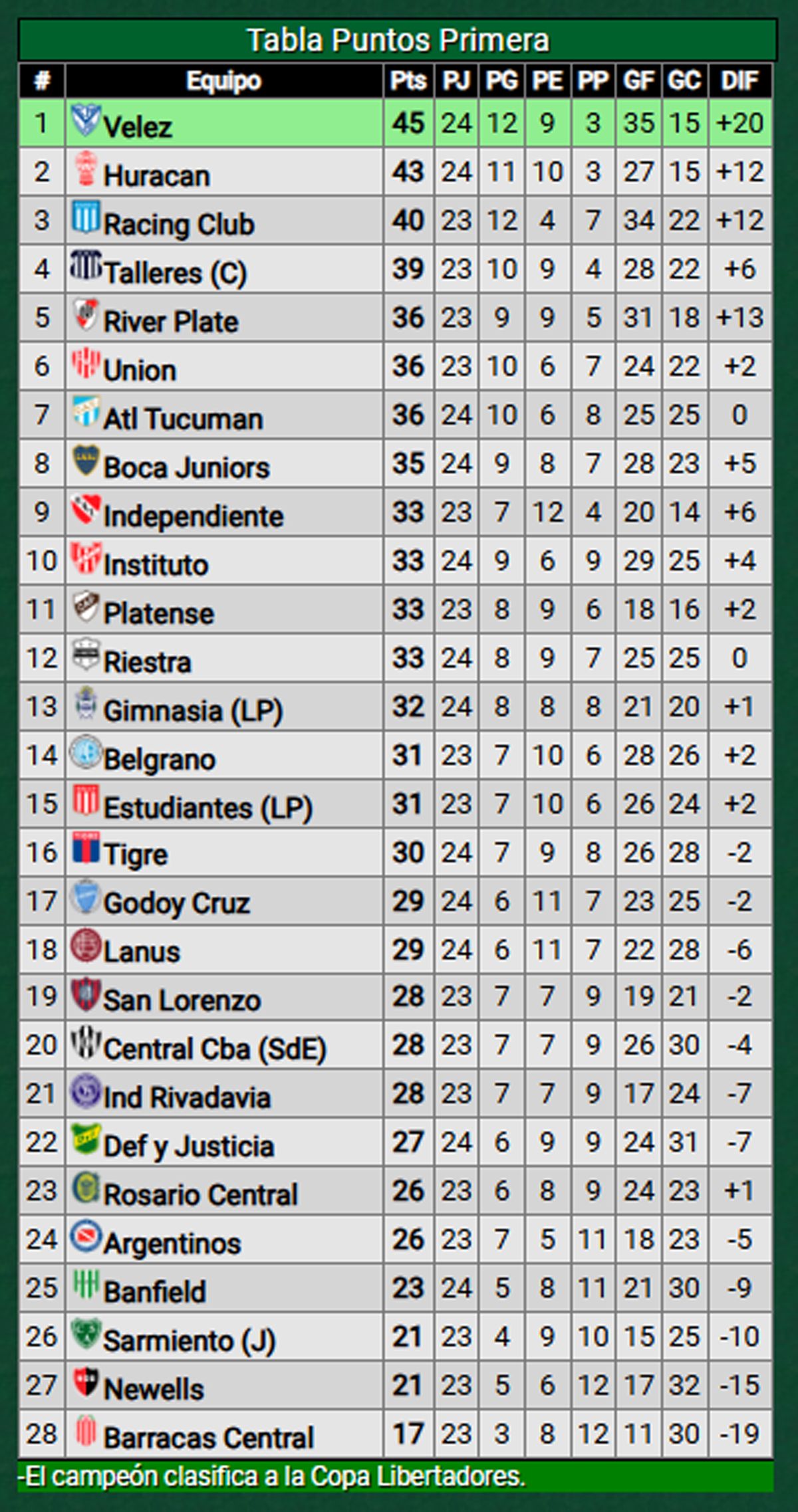 Vélez sigue siendo el puntero con 45 puntos en 24 partidos, pero lleva 3 encuentros sin ganar y este miércoles debe jugar la semifinal de la Copa Argentina ante Boca, lo que implicará un desgaste extra antes de recibir el domingo próximo a Sarmiento.