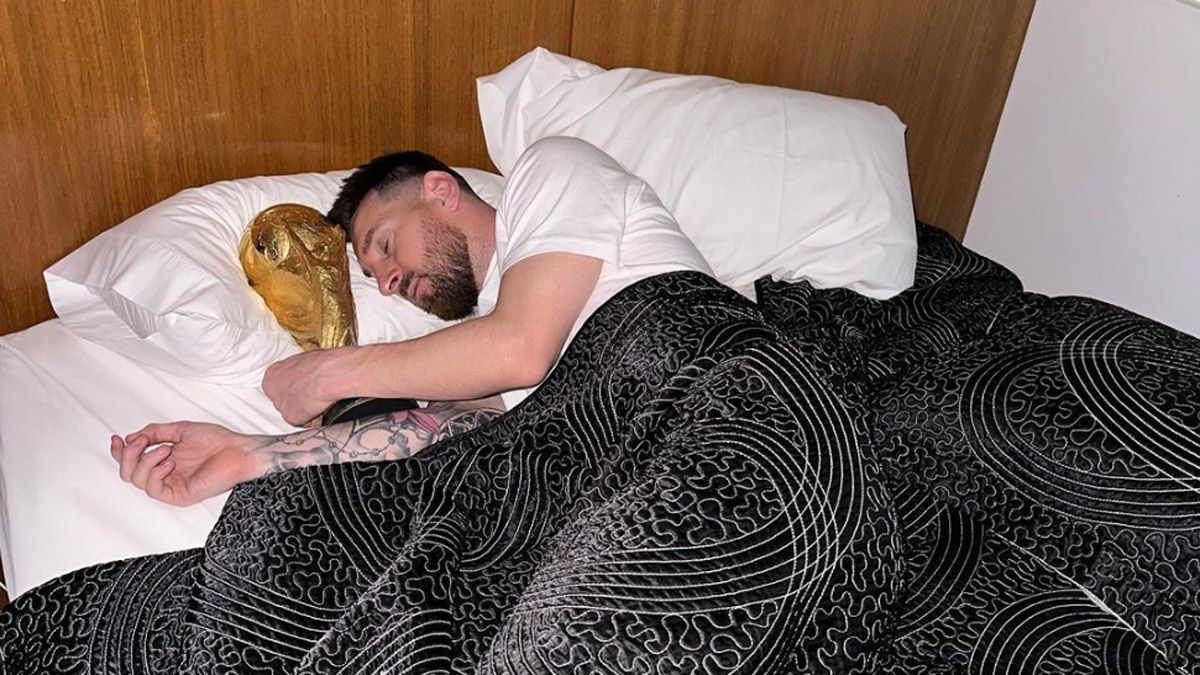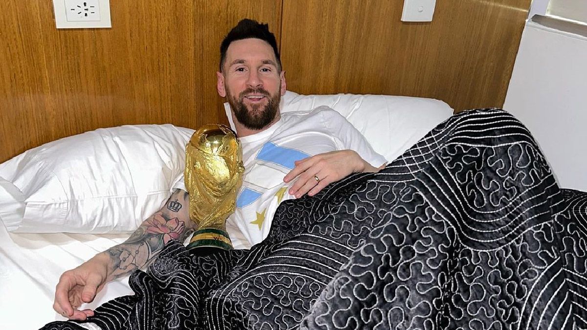 “¡Buen día!”, publicó el capitán de la Selección argentina, junto a tres imágenes. En las mismas se lo puede ver en la cama, abrazando la Copa del Mundo y mate en mano.