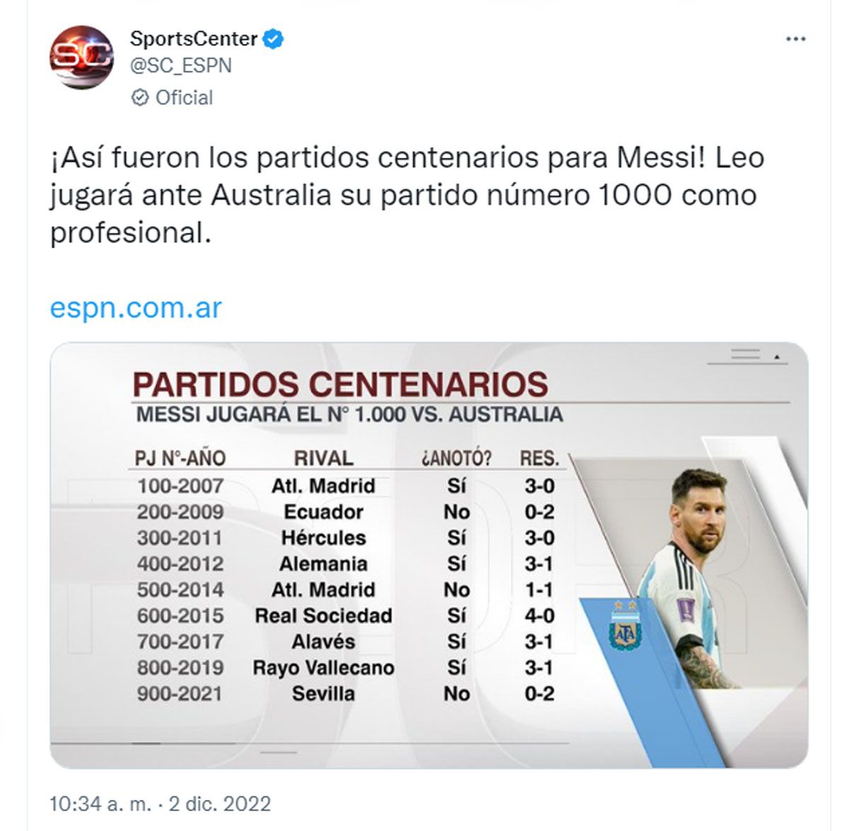 Desde aquel Barcelona 1- Espanyol 0 del 16 de octubre de 2004 hasta el Argentina 2- Polonia 0 del pasado miércoles, el ganador de 7 Balones de Oro disputó 999 partidos.