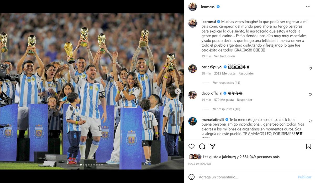 En su cuenta de Instagram, acompañado de varias fotos de lo que fue el encuentro ante Panamá, Lionel Messi, capitán de la Selección argentina posteó: “Muchas veces imaginé lo que podía ser regresar a mi país como campeón del mundo pero ahora no tengo palabras para explicar lo que siento, lo agradecido que estoy a toda la gente por el cariño… Están siendo unos días muy muy especiales y solo puedo decirles que tengo una felicidad inmensa de ver a todo el pueblo argentino disfrutando y festejando lo que fue otro éxito de todos. GRACIAS!!!”