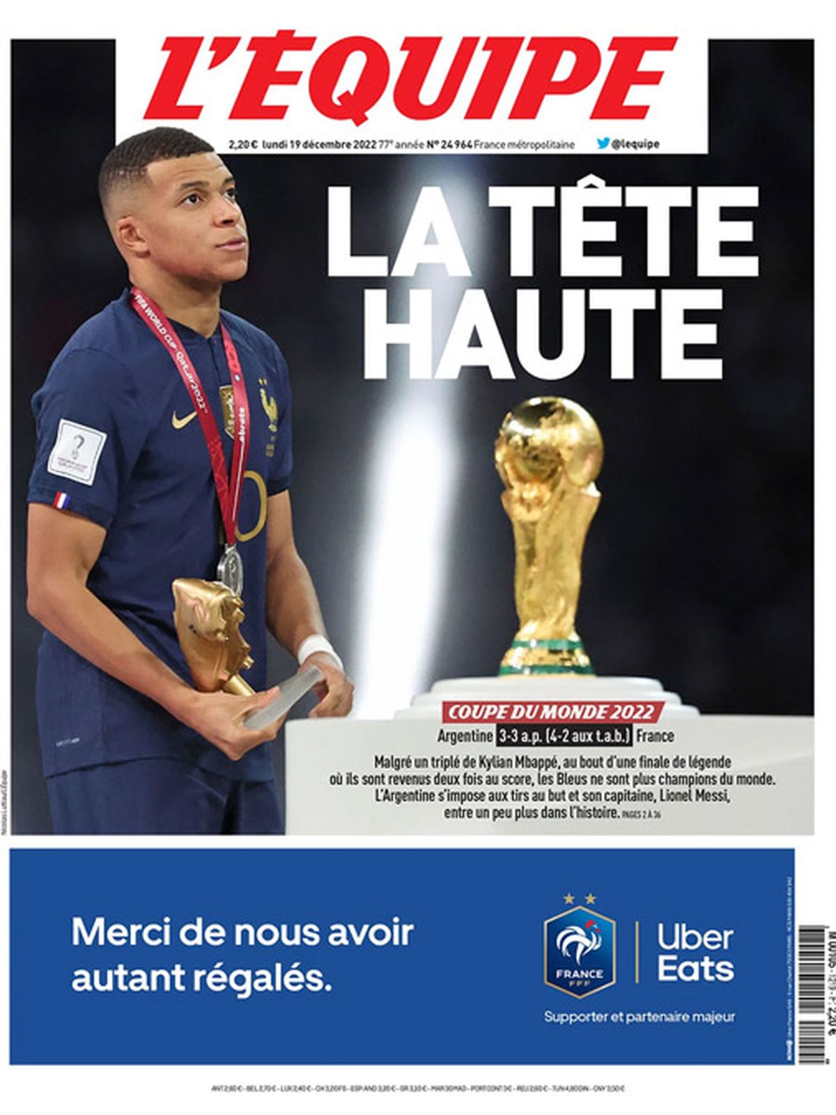 Francia: Con una foto de Kylian Mbappé resignado al momento de recibir la medalla del segundo puesto, L'Equipe tituló: "Con la cabeza alta".