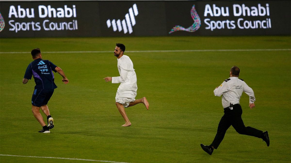 En dos oportunidades, Lionel Messi fue blanco de los hinchas, que se metieron a la cancha en Abu Dhabi y corrieron para abrazarlo.