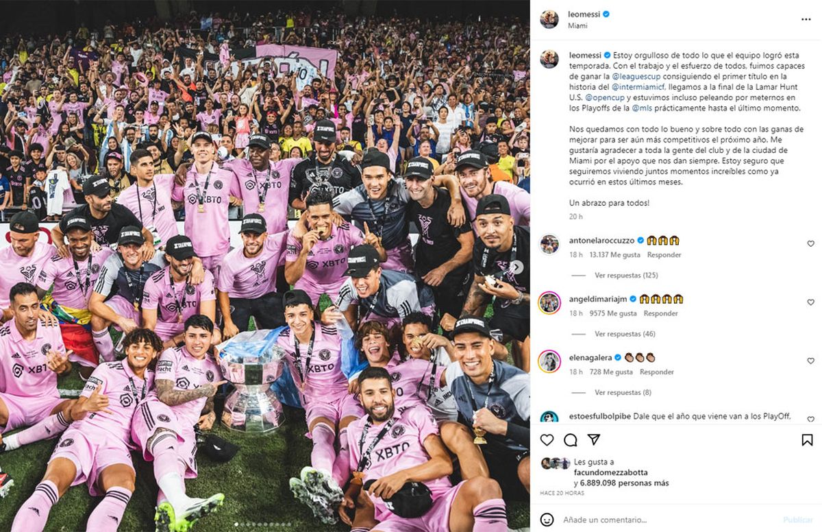 "Estoy orgulloso de todo lo que el equipo logró esta temporada. Con el trabajo y el esfuerzo de todos, fuimos capaces de ganar la Leagues Cup consiguiendo el primer título en la historia del Inter Miami, llegamos a la final de la US Open Cup y estuvimos incluso peleando por meternos en los Playoffs de la MLS prácticamente hasta el último momento", escribió Lionel Messi en su cuenta oficial de la red social Instagram.