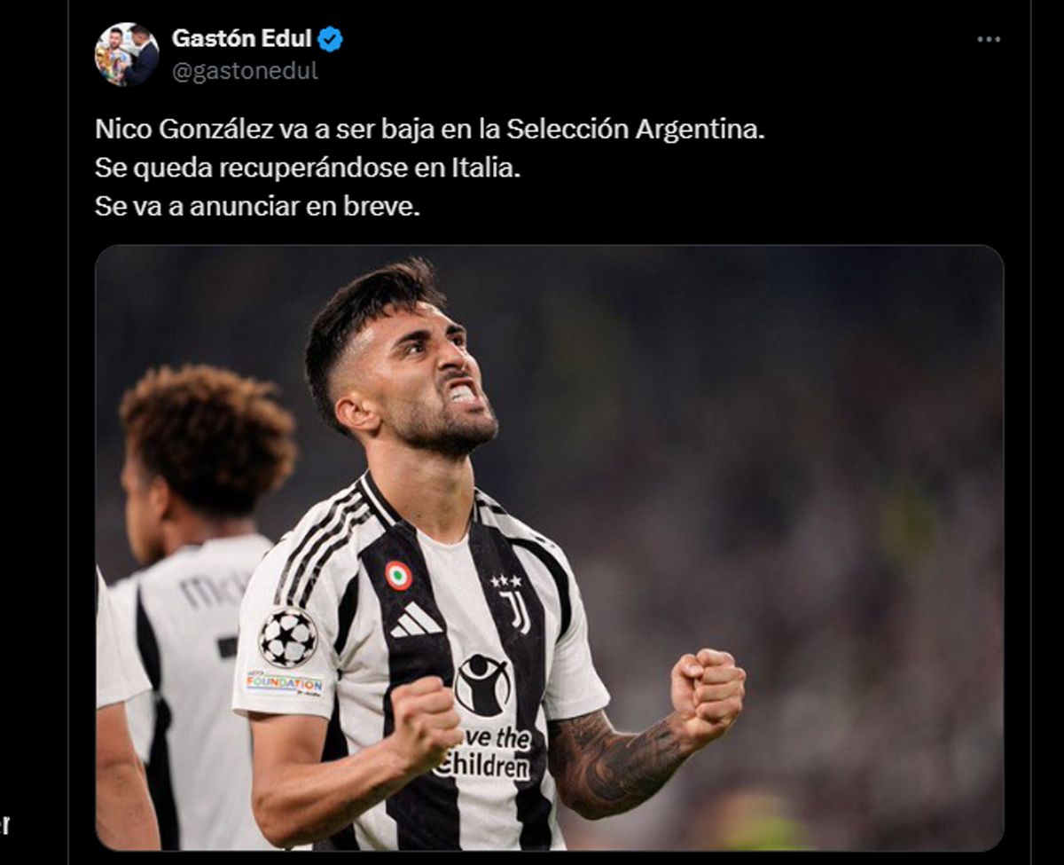 Nico González se está recuperando de una lesión en el recto femoral derecho sufrida en los primeros días de octubre, pero volvió a sentir una molestia, no pudo sumar minutos en su club y no estará en la convocatoria para continuar con su rehabilitación.