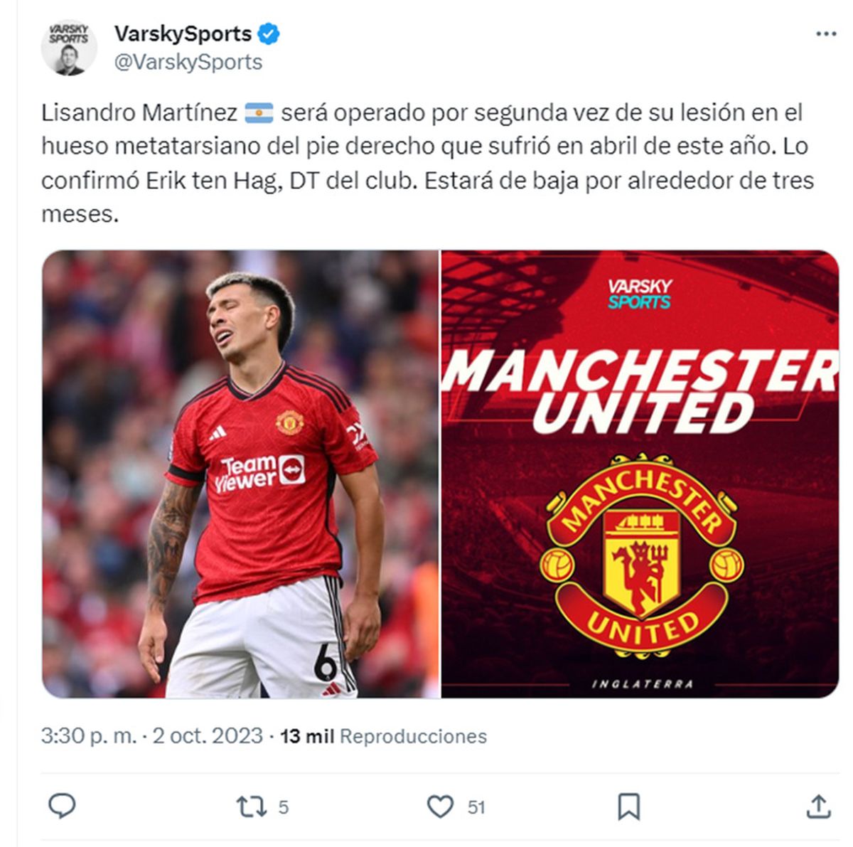 El defensor de Manchester United y de la Selección argentina, Lisandro Martínez, deberá ser operado nuevamente por la lesión en el metatarsiano del pie izquierdo.