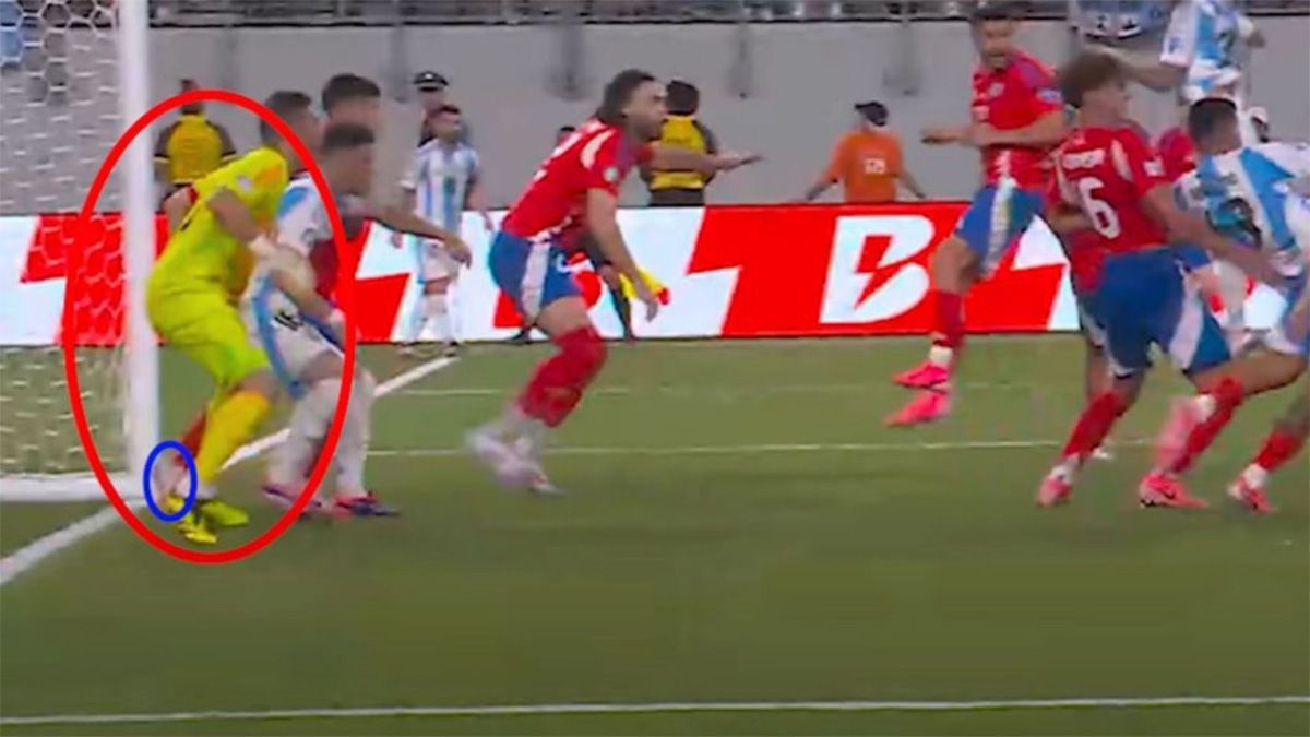 Según los audios del VAR, el juez de línea había visto la posición lícita de Lo Celso desde el principio. Y luego lo respaldan con el trazado de líneas: los pies de Bravo y del defensor chileno aparecen por detrás de la posición del 16 argentino.