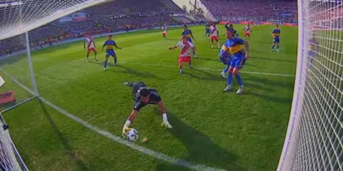 La foto muestra la atajada del arquero xeneize y claramente se ve que el palo tapa parte del circunferencia del balón.
