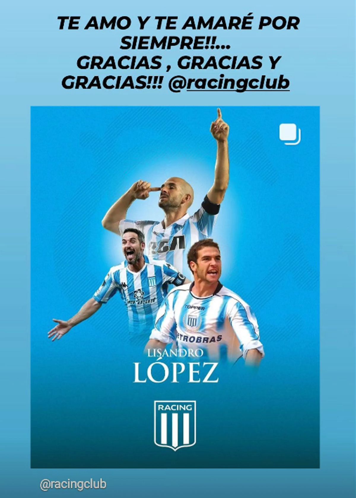 Querido Licha: Este posteo, más que para despedirte, es para agradecerte por todo lo que nos diste a los hinchas de Racing. Sabés lo que te admiro y el cariño que siento por vos. Tuve la suerte de verte crecer, pero también tengo el honor de decir que sos uno de los mejores jugadores con los que jugué. Vestir juntos nuestra camiseta es una de las cosas que más disfruté en mi carrera.