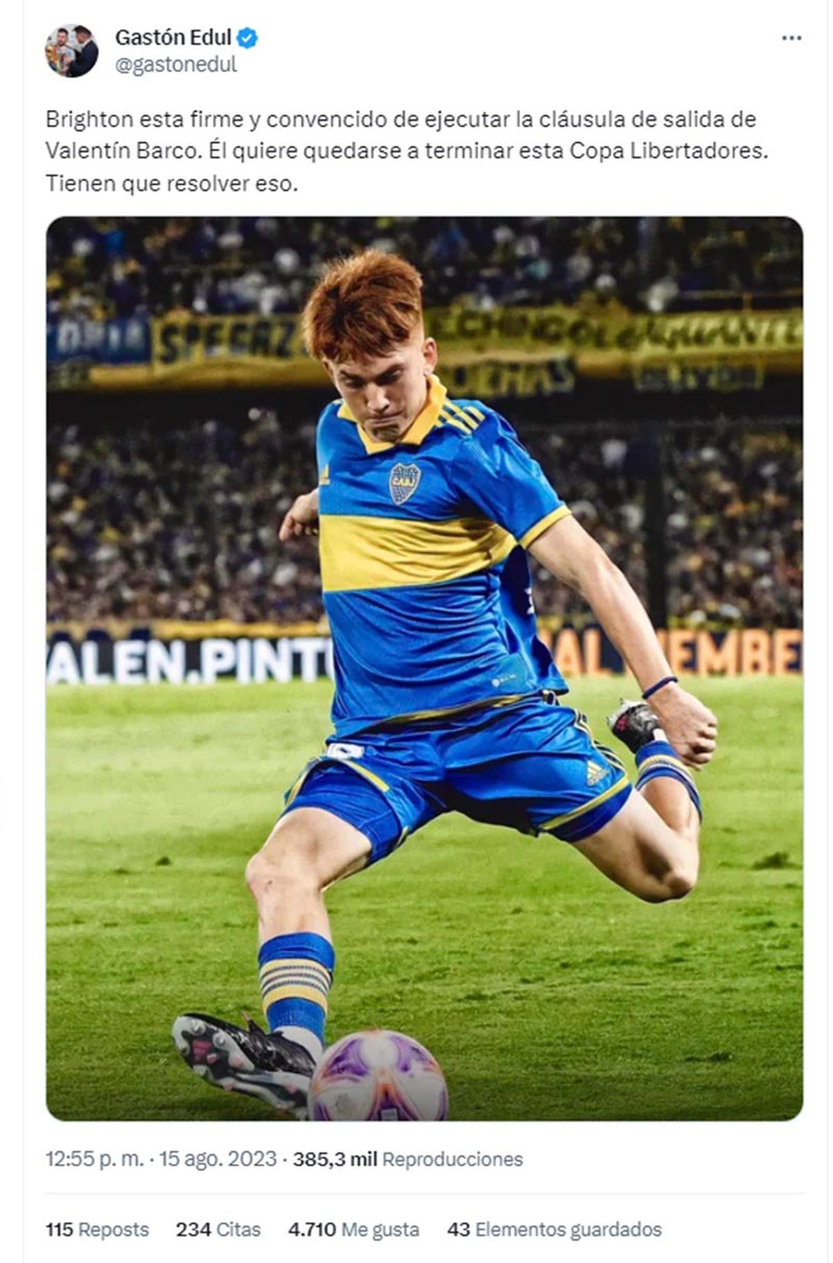 El jugador de Boca Valentín Barco podría emigrar al Brighton and Hove Albion de Inglaterra que está dispuesto a pagar los 10 millones de dólares de cláusula que tiene el juvenil.