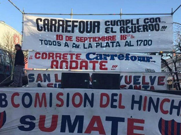 Simpatizantes de San Lorenzo, convocados por la Subcomisión del Hincha del club, se reunieron este jueves frente al predio de Carrefour, en Avenida La Plata al 1.700, para exigir el cumplimiento del acuerdo firmado entre el club y la empresa francesa en abril de 2014.Con banderas y camisetas azulgranas, los hinchas empezaron a llegar al lugar después de las 16:00, aunque el acto central estaba previsto para la noche por los organizadores, quienes pidieron no llevar bengalas ni pirotecnia.