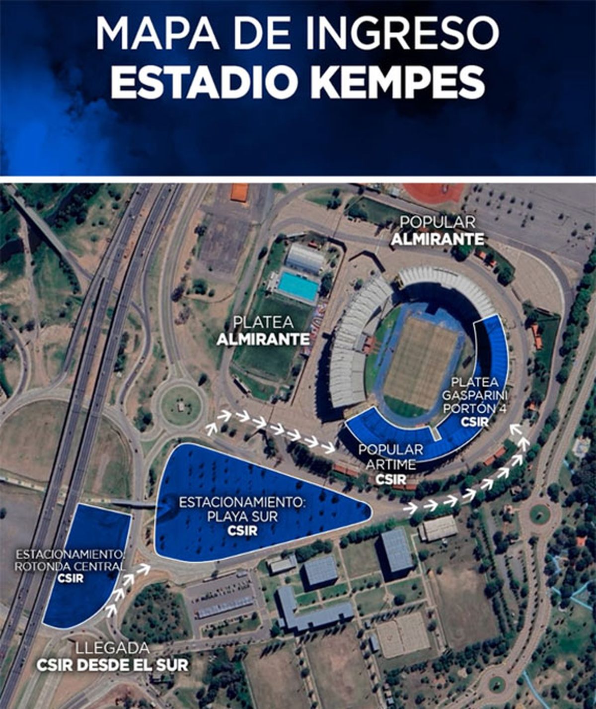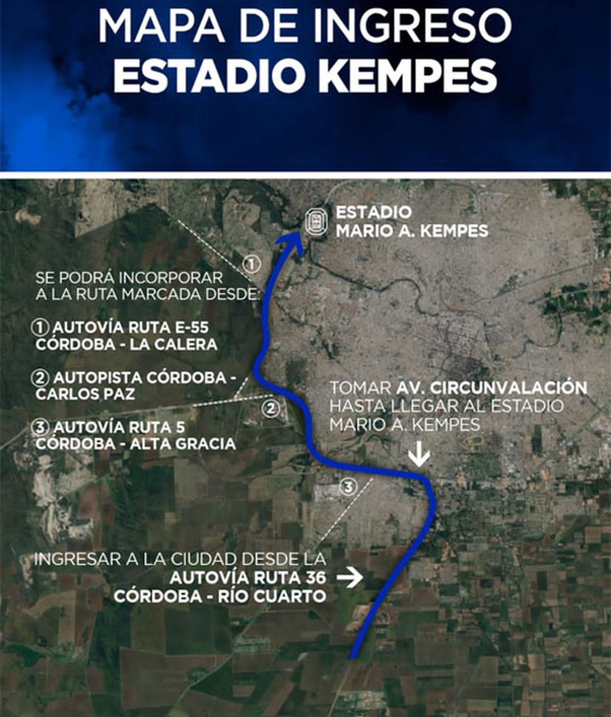 - Se recomienda llegar al estadio Mario Alberto Kempes por la Autovía Ruta 36 desde Río Cuarto.