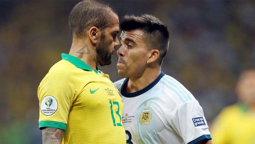 Cuando se jugaban 39 minutos del primer tiempo entre Argentina y Brasil, Marcos Acuña su cruzó con Dani Alves y quedaron cara a cara.