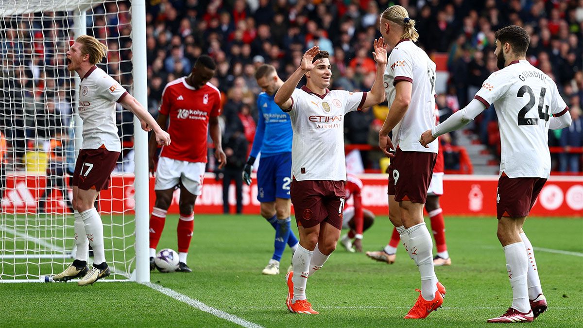 El Manchester City del delantero argentino Julián Álvarez superó este domingo por 2 a 0 al Nottingham Forest y sigue luchando por ganar la Premier League.