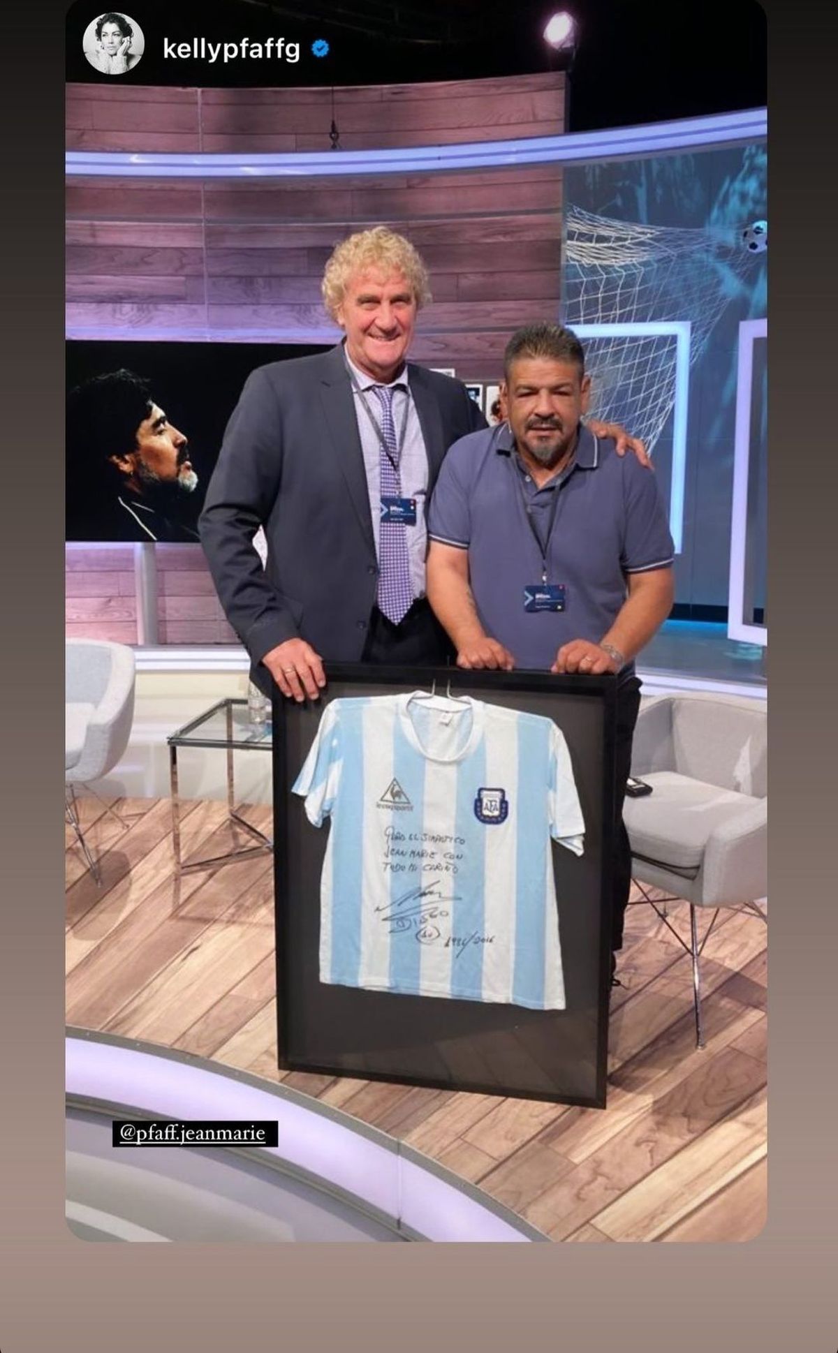 Pfaff y el Turco posaron con la camiseta celeste y blanca, enmarcada. La misma con la que Diego marcó dos goles que clasificaron a Argentina a la final del Mundial de México, hace 35 años.