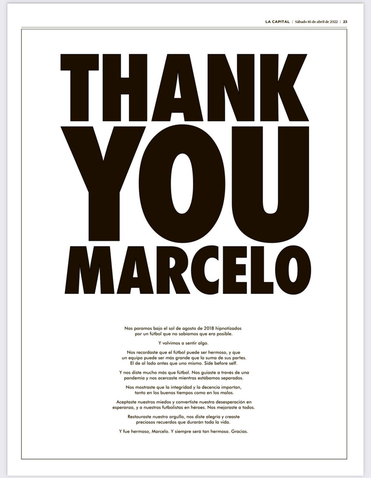 Hinchas del Leeds United compraron una página de la edición de este sábado de La Capital, el diario decano de la ciudad de Rosario, para publicar un mensaje de agradecimiento a Marcelo Bielsa.