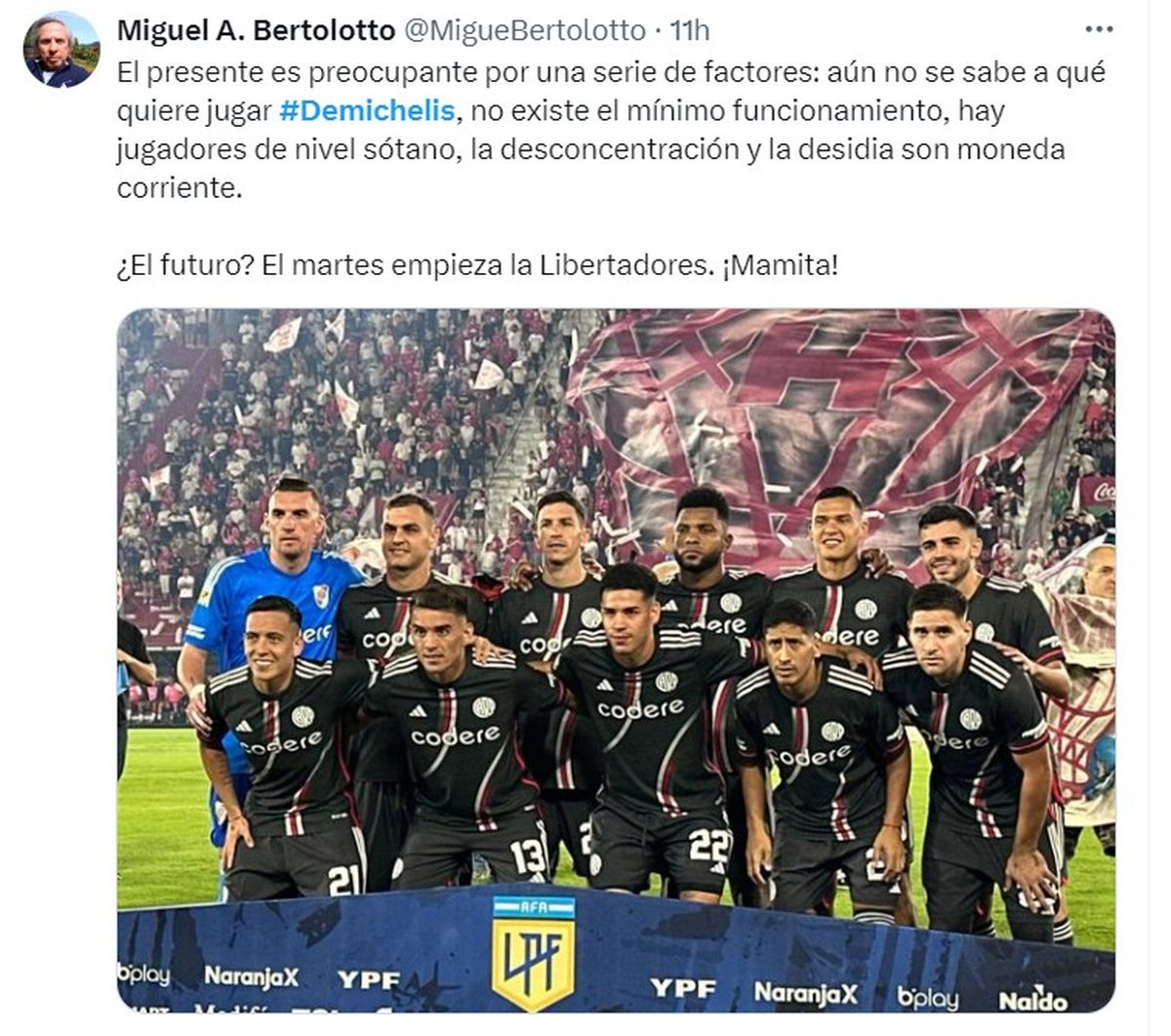 "Hay unos números que reflejan un montón de cosas hasta hoy, después perder siempre duele. Pero si repasás las estadísticas en un montón de cosas, no quiero decir que somos los mejores, éramos el equipo que está posicionado en un montón de cosas que reflejan las estadísticas. Entonces, no sé de qué mensaje me hablás, porque la idea refleja buenos números, a pesar de que hoy hayamos perdido. Donde el rival casi no nos llegó y nos concretó, y nosotros tuvimos y nos concretamos. No hay mucho más para explicar", sentenció Martín Demichelis.