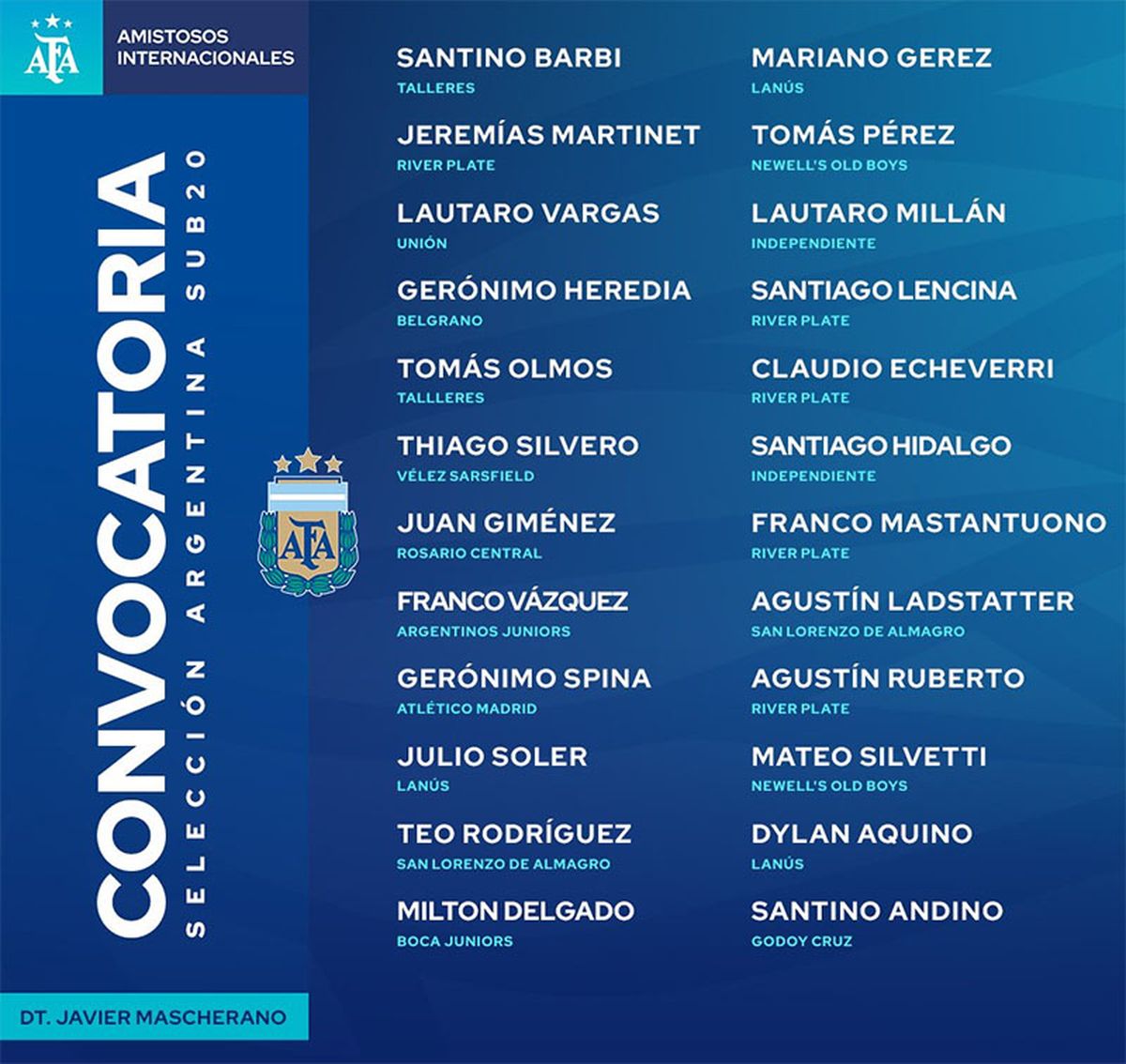 El entrenador de la Selección argentina Sub 20, Javier Mascherano, confirmó la lista para los amistosos ante Bolivia e incluyó a un jugador mendocino. Se trata del delantero de Godoy Cruz Santino Andino.