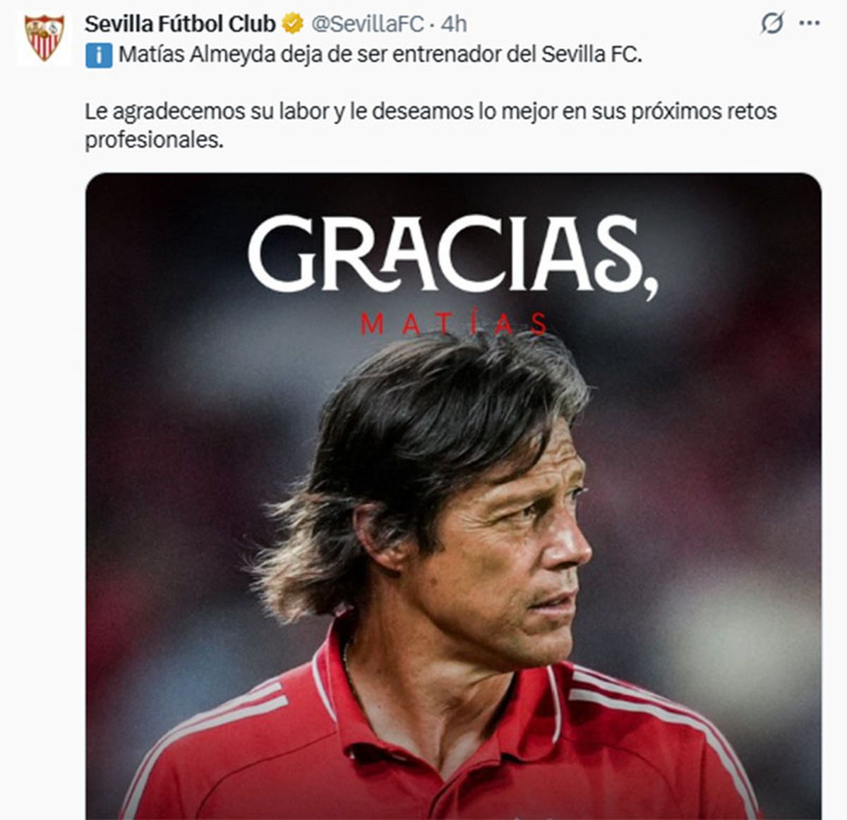 “El Sevilla desea agradecer el trabajo de Matías Almeyda y su equipo en estos meses y le desea la mejor de las suertes en sus próximos retos profesionales”, se destaca al final del comunicado.