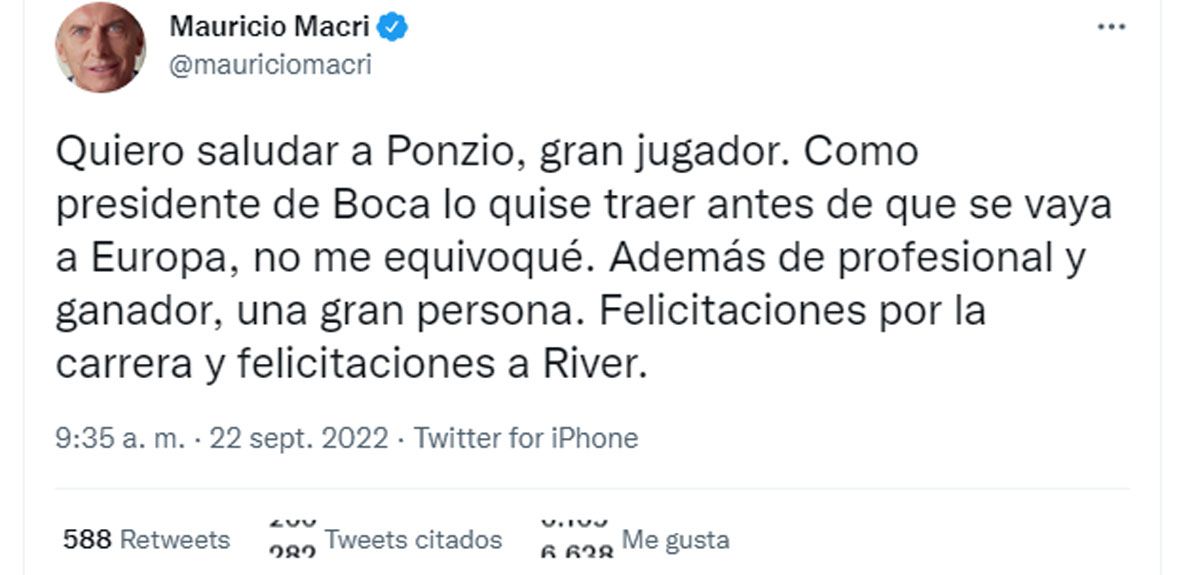 "Quiero saludar a Ponzio, gran jugador. Como presidente de Boca lo quise traer antes de que se vaya a Europa, no me equivoqué. Además de profesional y ganador, una gran persona. Felicitaciones por la carrera y felicitaciones a River", expresó el ex Presidente de la Nación y que también fue presidente de Boca.
