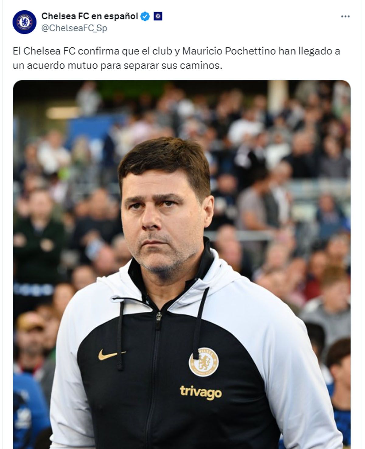 "El Chelsea FC confirma que el club y Mauricio Pochettino han llegado a un acuerdo mutuo para separar sus caminos", indicó la cuenta del club en español donde casualmente su foto anterior fue el domingo e indicaba "5 victorias consecutivas para cerrar la campaña".