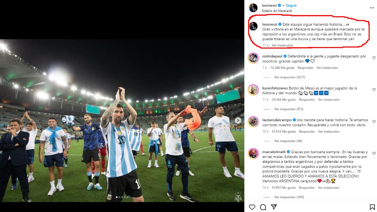 "Este equipo sigue haciendo historia…Gran victoria en el Maracaná aunque quedará marcada por la represión a los argentinos una vez más en Brasil. Esto no se puede tolerar, es una locura y se tiene que terminar ya", escribió Messi durante la madrugada de Río de Janeiro en su cuenta oficial de Instagram.