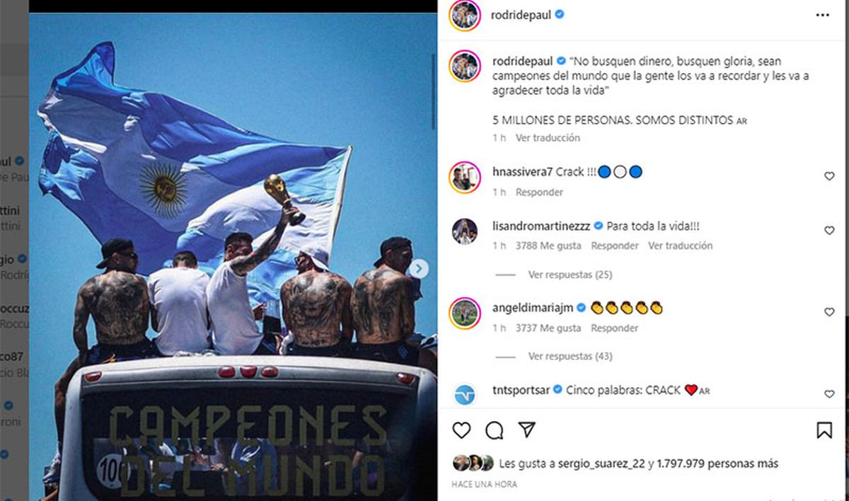 De Paul subió varias fotos con la Copa del Mundo, en compañía de Lionel Messi, Nicolás Otamendi, Ángel Di María y Exequiel Palacios, mientras a sus espaldas un grupo nutrido de hinchas buscó un saludo de sus ídolos futboleros.
