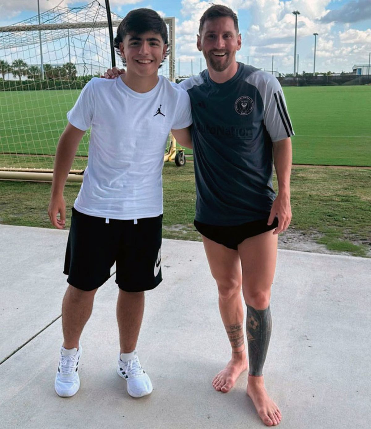 El astro Lionel Messi estuvo en el entrenamiento con Benjamín Agüero, el hijo de su amigo el Kun y se sacó una foto con él.