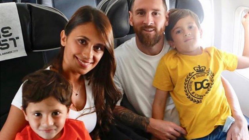 El crack rosarino publicó una foto sentado en el avión junto a su mujer, Antonela Roccuzzo, y dos de los tres hijos de la familia: Thiago y Mateo.