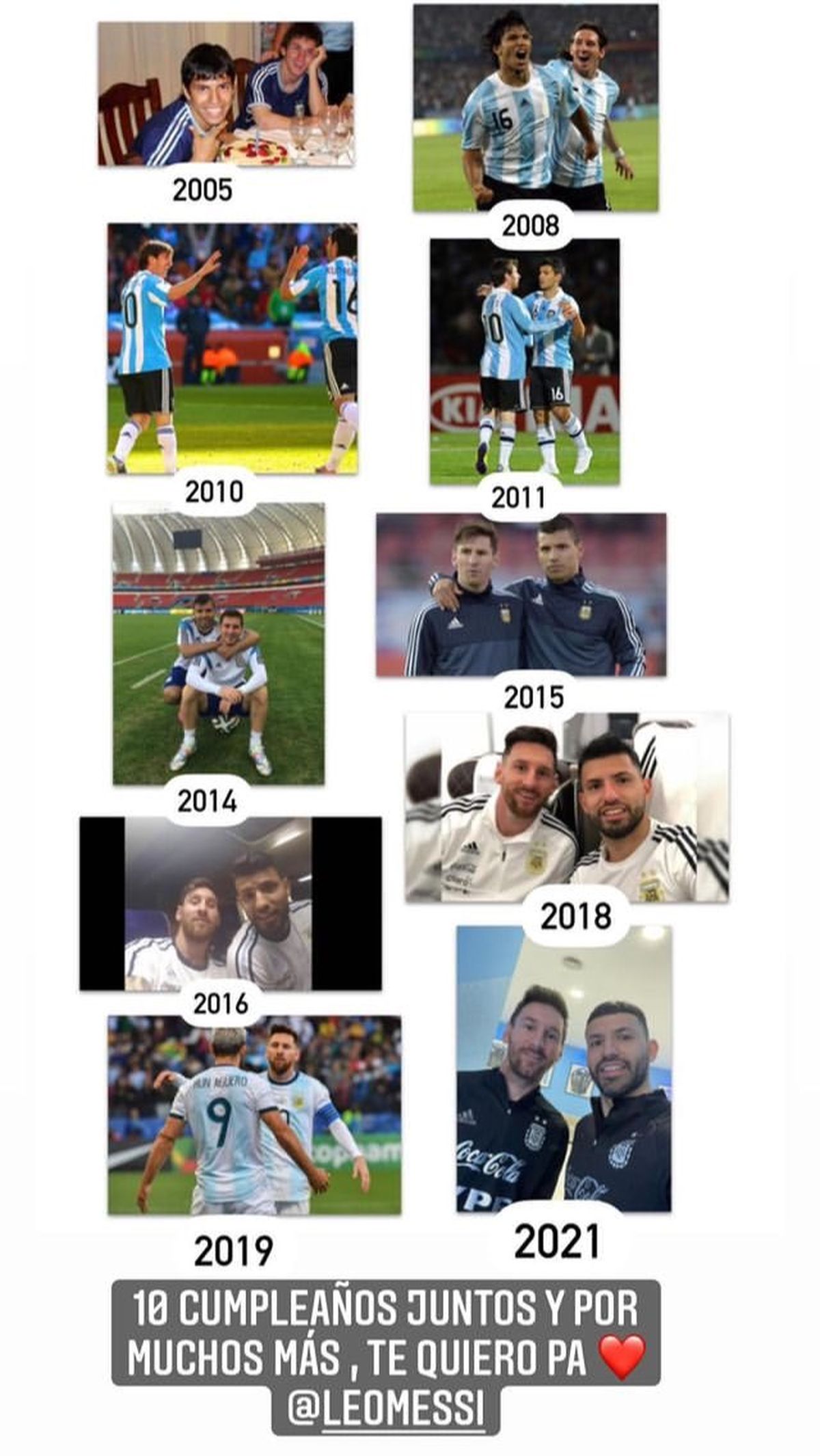 El Kun Agüero compartió fotos que van desde el Mundial sub 20 del 2005 hasta la actual Copa América 2021 de los 10 cumpleaños que pasó junto a Lionel Messi en la Selección Argentina: "10 cumpleaños juntos y por muchos más, te quiero Pa", dijo el delantero.