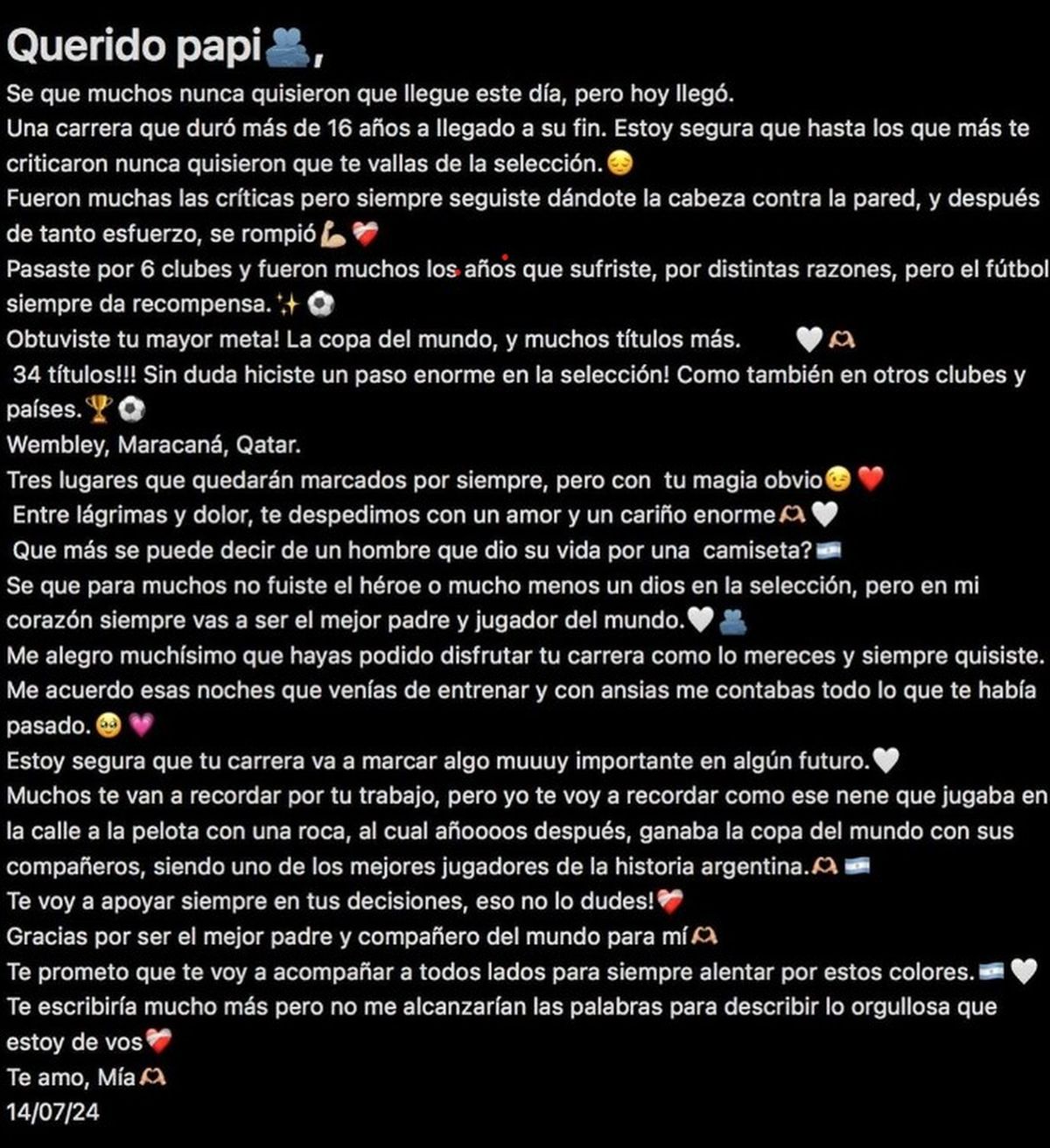 Mía, la hija mayor de Ángel Di María, publicó una emotiva carta en sus redes sociales dedicada a su padre tras haber obtenido la Copa América en el que fue su último partido en la Selección argentina.
