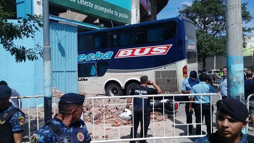 Luego de quedar atorado, el ómnibus hizo marcha atrás para ingresar nuevamente y fue ahí cuando tiró una de las paredes cayendo sobre un agente motorizado, que debió ser internado de urgencia.