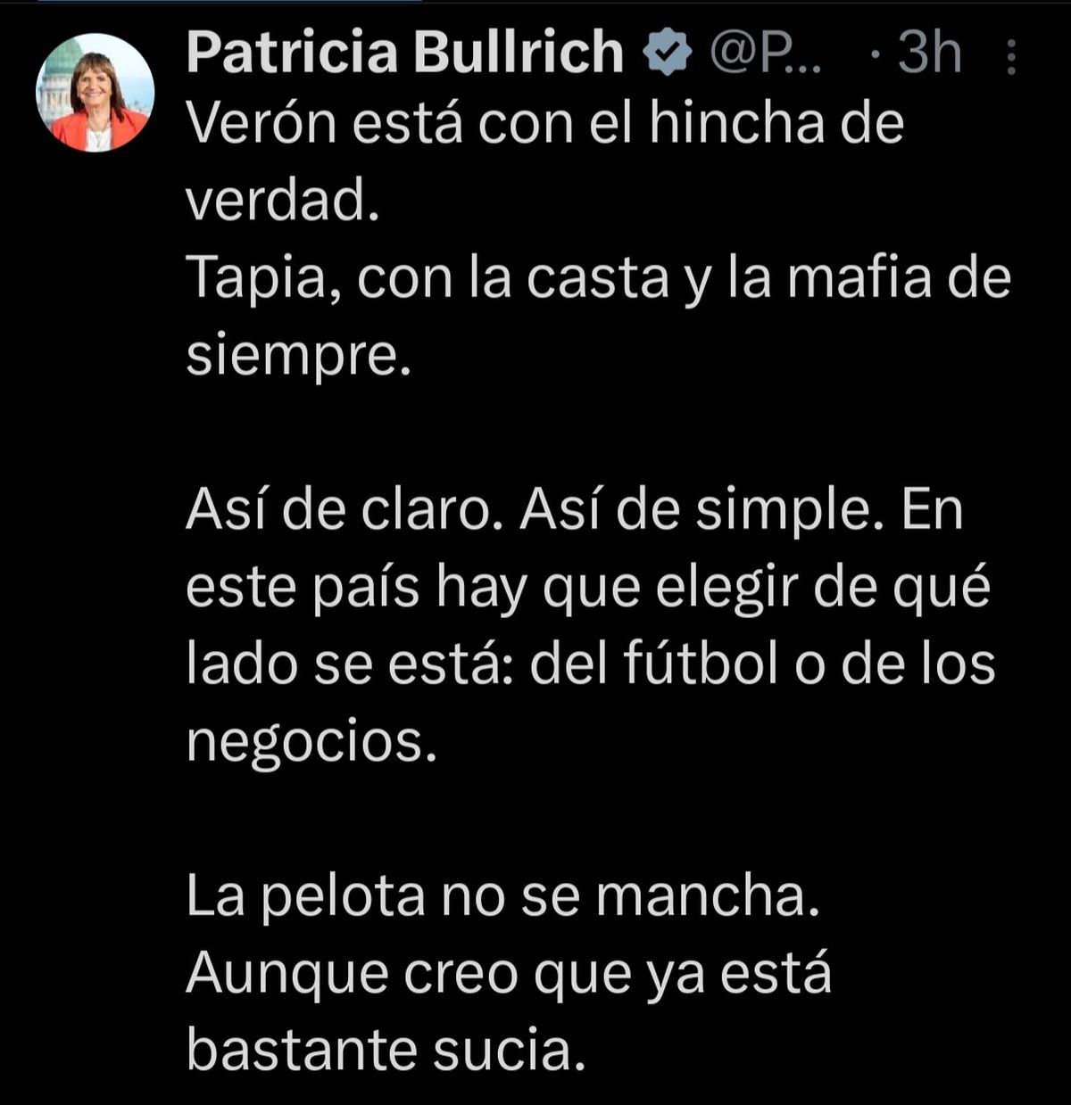 "Verón está con el hincha de verdad. Tapia, con la casta y la mafia de siempre. Así de claro. Así de simple. En este país hay que elegir de qué lado se está: del fútbol o de los negocios", dijo la Ministra de Seguridad.