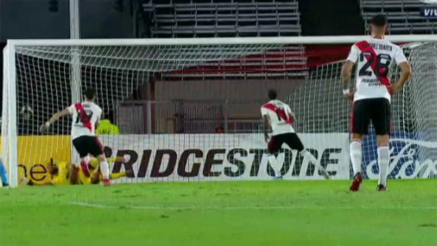 El volante de River, Nicolás De la Cruz perdió un penal increíblemente a los 14' del primer tiempo ante Binacional de Perú. El arquero visitante, Raúl Fernández le detuvo el remate al uruguayo.