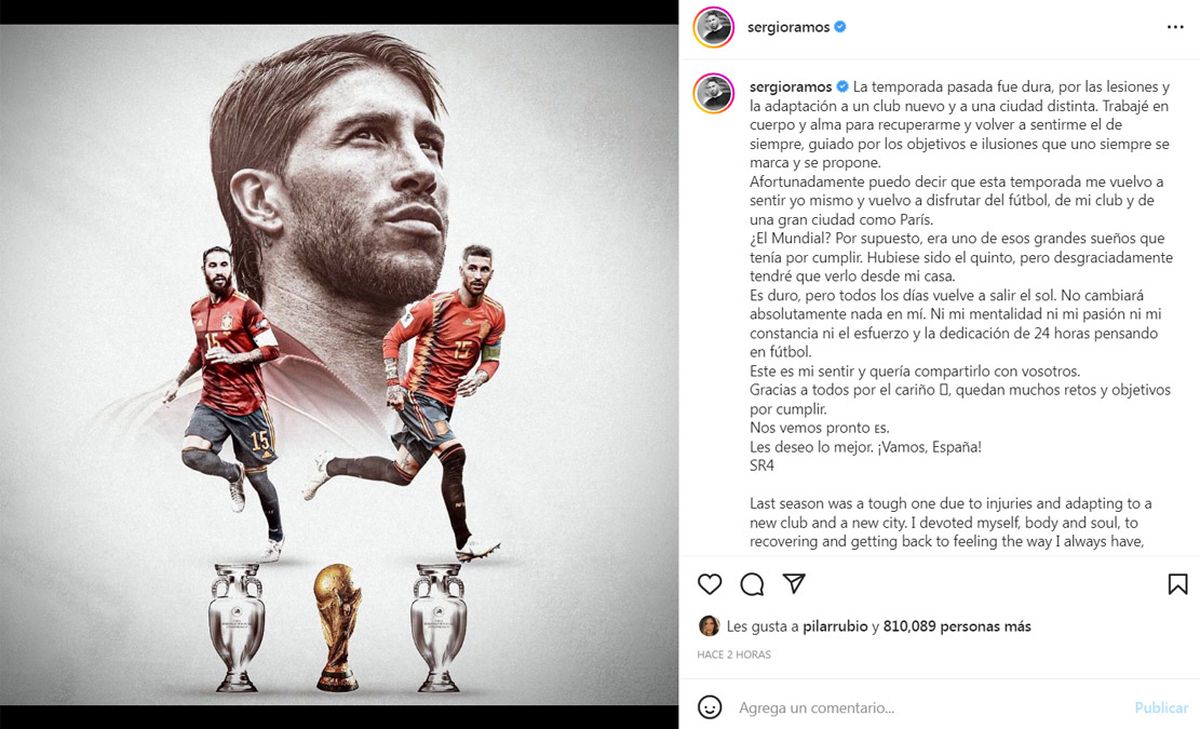 El defensor Sergio Ramos, del Paris Saint Germain (PSG), campeón del mundo con España en 2010, confesó que el Mundial Qatar 2022 era uno de los "grandes sueños" que le quedaban en su carrera y lamentó tener que verlo "desde casa" por su ausencia en la convocatoria del entrenador Luis Enrique.