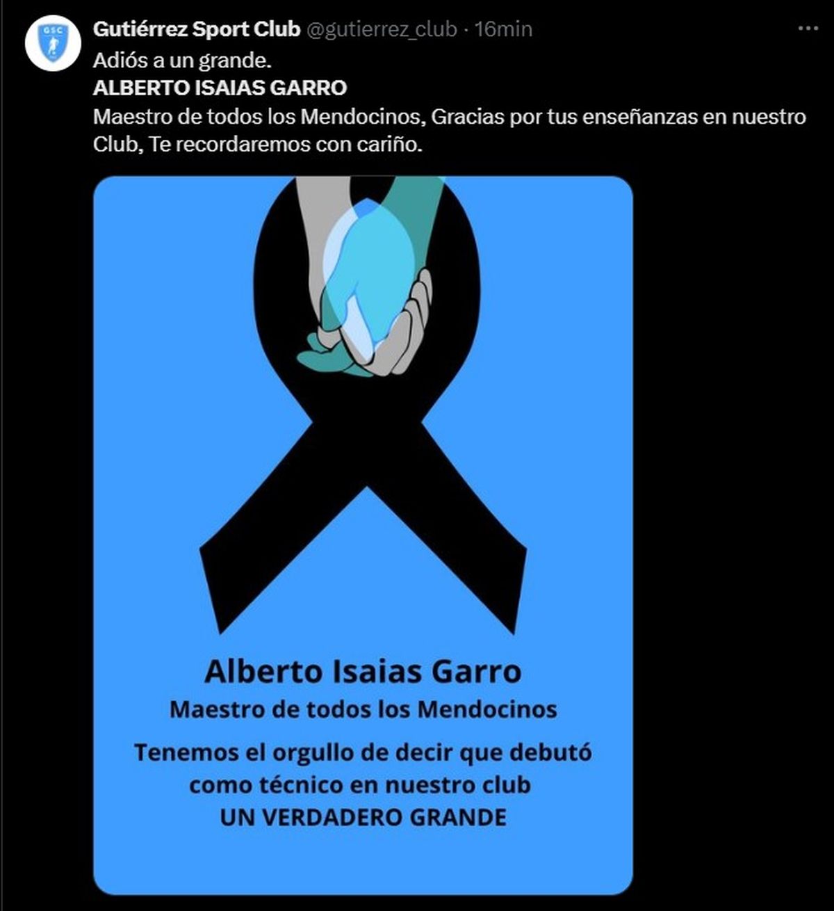 Justamente Godoy Cruz lamentó "profundamente el fallecimiento de Alberto Isaías Garro, técnico en nuestro histórico ascenso de 1994", al tiempo que lo describió como "un maestro del fútbol que formó parte de nuestro club desde 1988 y brindó todos sus conocimientos como técnico y formador, desde Primera División a Inferiores".