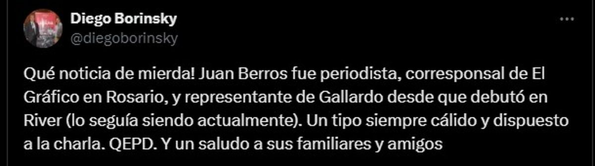 Juan Luis Berros, quien trabajó como periodista deportivo y era el representante de Marcelo Gallardo, falleció este lunes en Rosario después de haber estado internado el fin de semana.