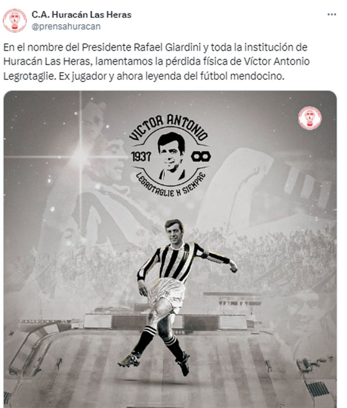 "En el nombre del Presidente Rafael Giardini y toda la institución de Huracán Las Heras, lamentamos la pérdida física de Víctor Antonio Legrotaglie. Ex jugador y ahora leyenda del fútbol mendocino", expresó Huracán Las Heras.