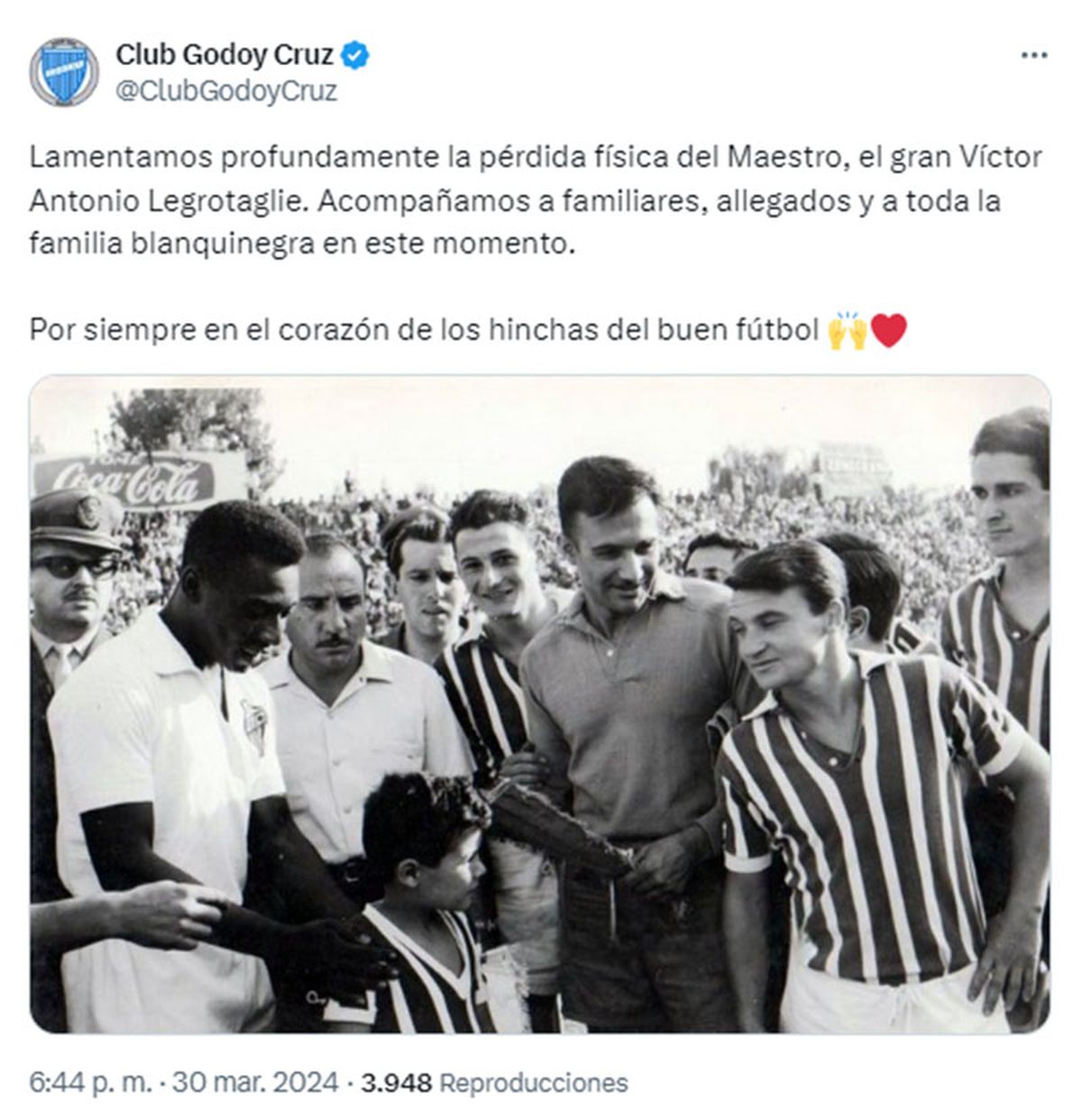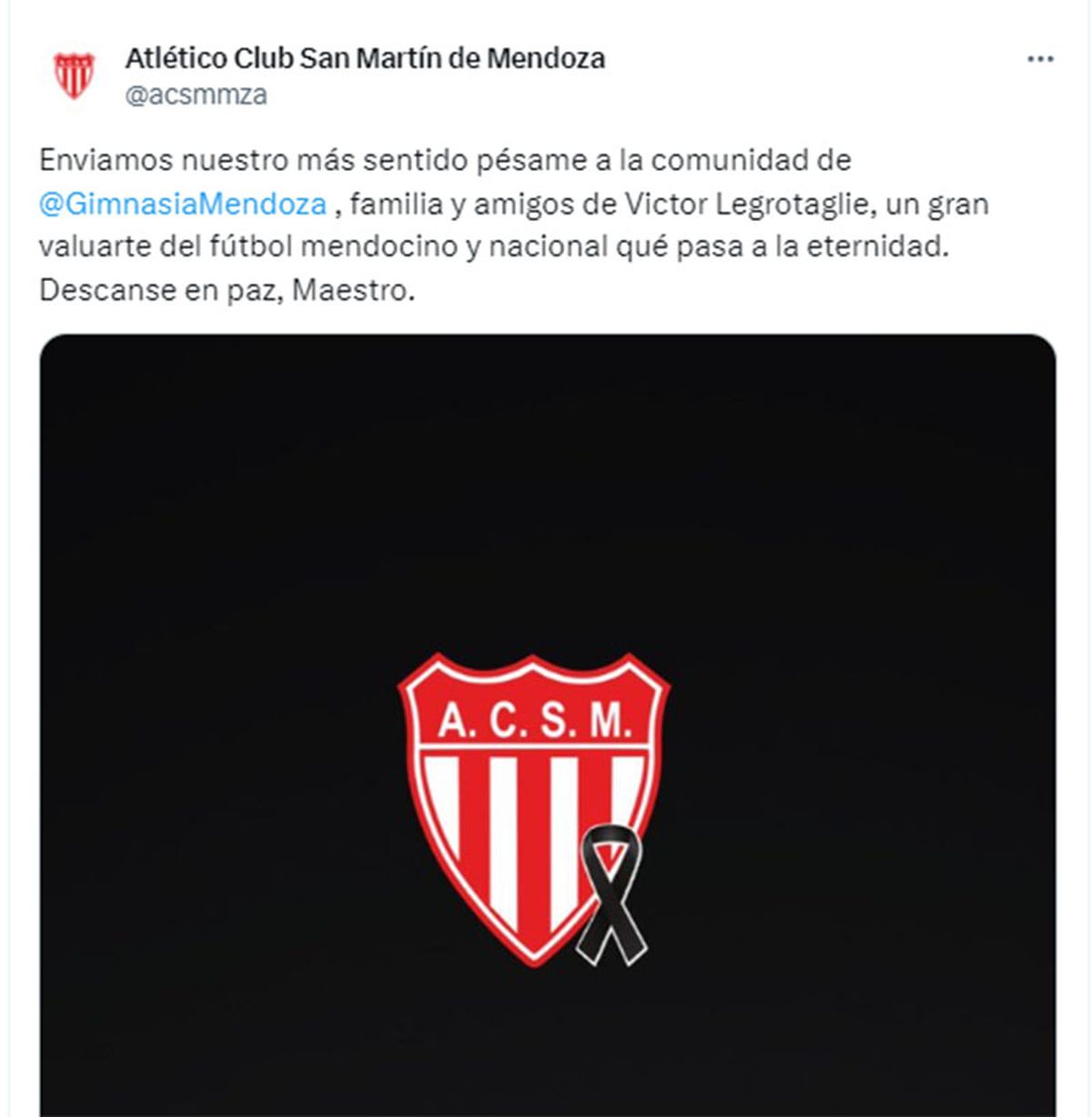 "Enviamos nuestro más sentido pésame a la comunidad de Gimnasia y Esgrima, familia y amigos de Víctor Legrotaglie, un gran baluarte del fútbol mendocino y nacional que pasa a la eternidad. Descanse en paz, Maestro", expresó el Atlético Club San Martín.