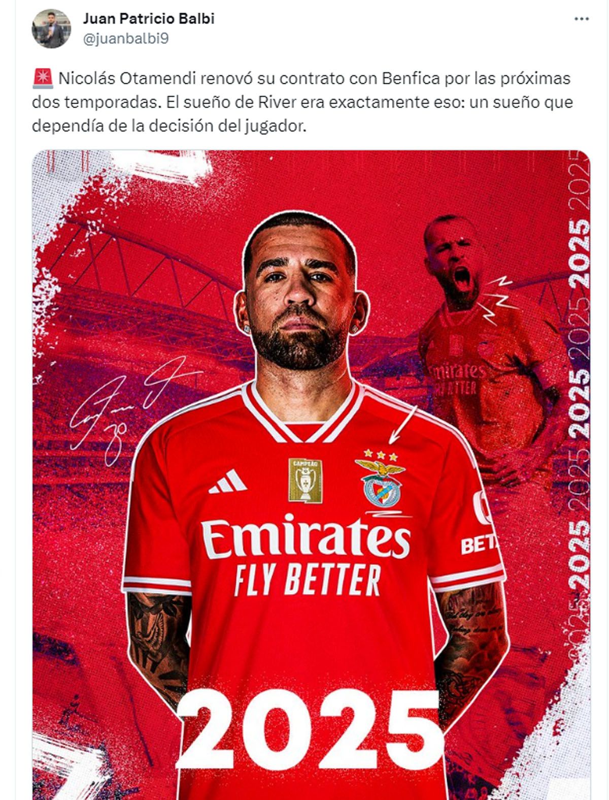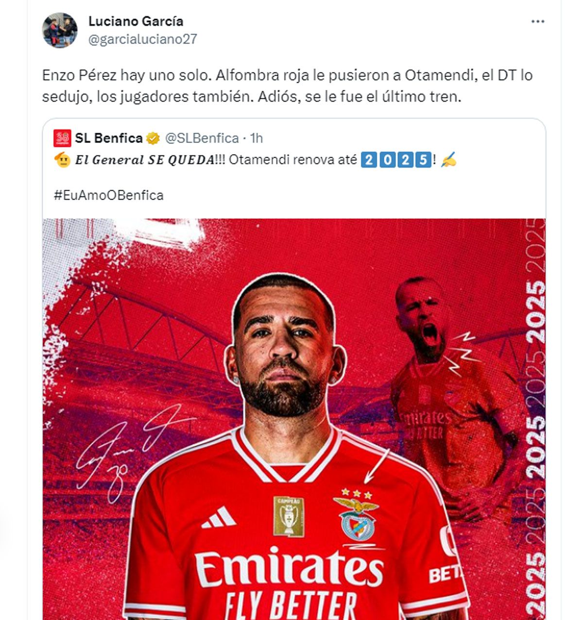 "El General, se queda!!!", celebró Benfica en Twitter con la imagen del defensor campeón con Argentina en Qatar 2022.