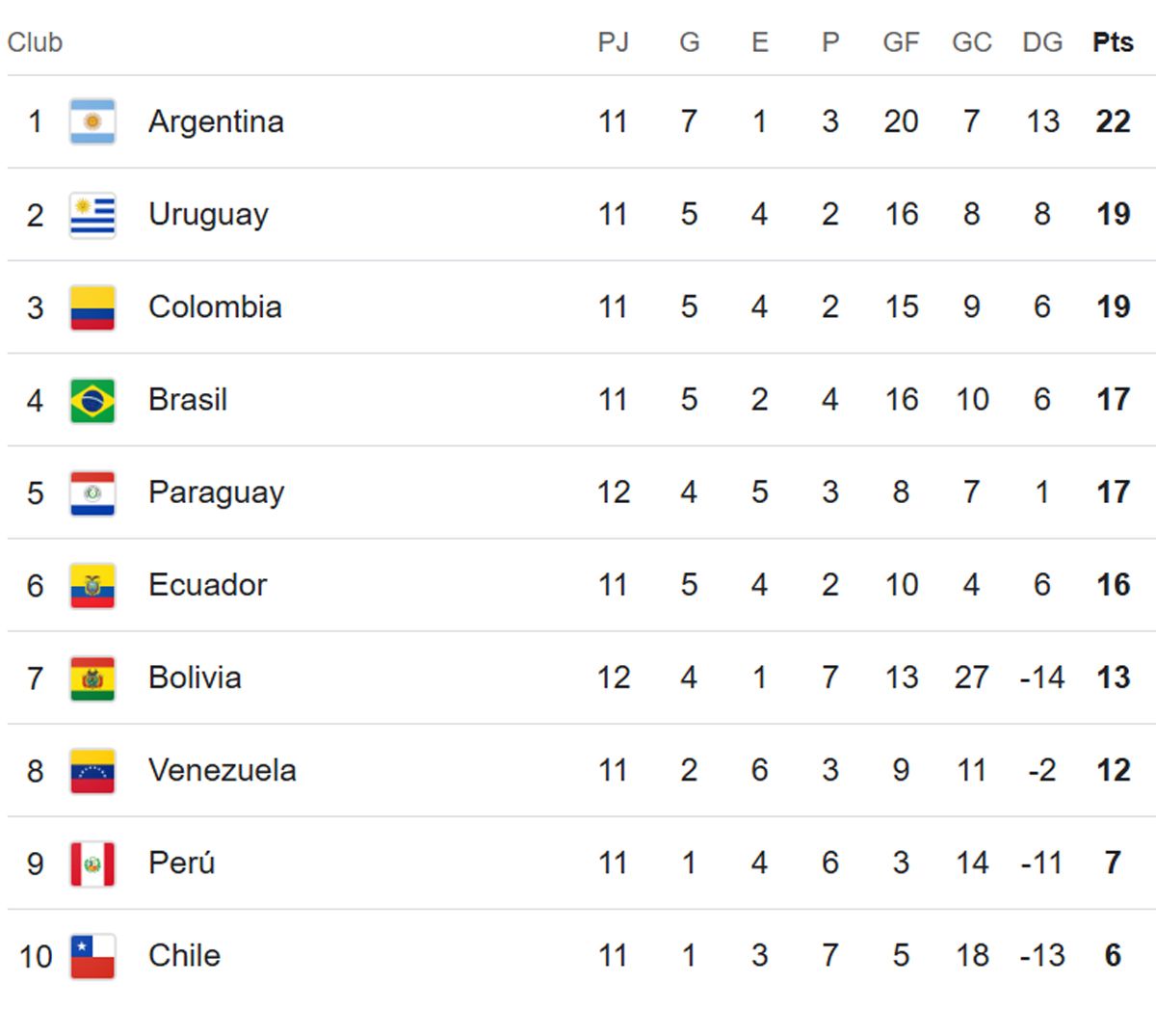 Bolivia, que dejó escapar dos puntos, tiene 13 puntos y está en el puesto 7 que lo clasificaría al repechaje, aunque Venezuela lo sigue a un punto y aún debe jugar con Chile.