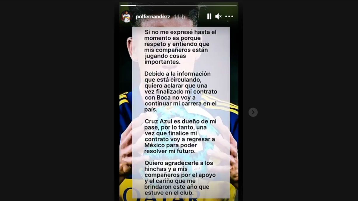 "No voy a jugar en ningún otro club de Argentina, y si no hablé de mi situación antes fue por respeto a mis compañeros, pero cuando finalice mi contrato me iré a México para resolver mi futuro con Cruz Azul", aclaró Guillermo Matías Fernández en su cuenta de Instagram.