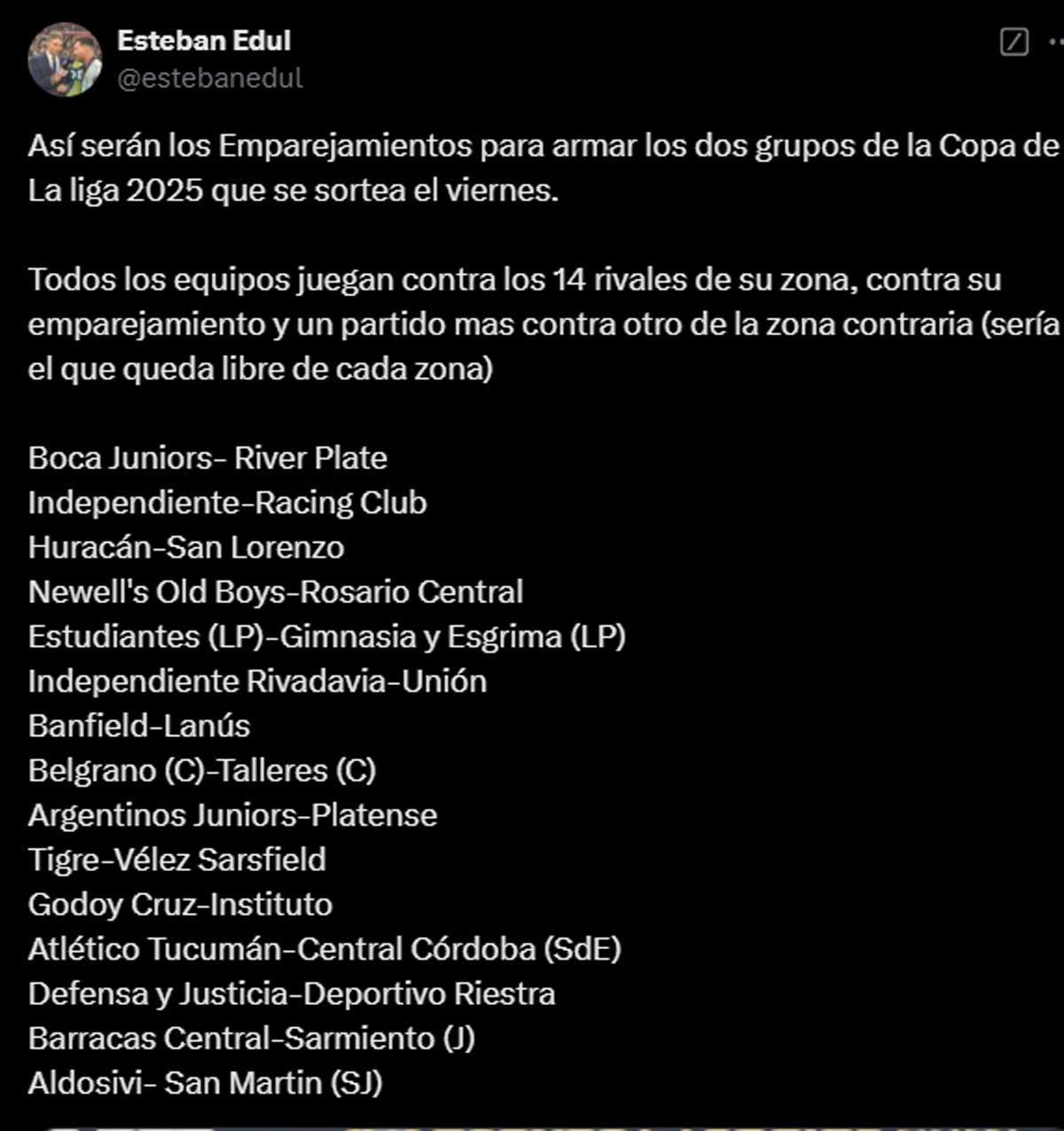 En la Copa de la Liga Profesional 2025 todos los equipos jugarán contra los 14 rivales de su misma zona, contra su emparejamiento y un partido más contra un equipo de la otra zona que sería entre los dos equipos que quedan libres en cada zona.